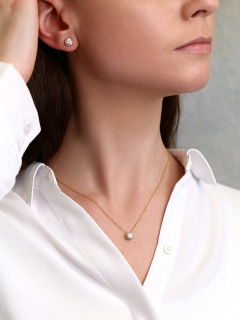 Get ready to shine with these 14kt gold Gemma studs! Featuring a dazzling 1ct total weight moissanite center stone sand diamond halo, these 5mm earrings are classic yet whimsical. And the best part? They're ready to ship!