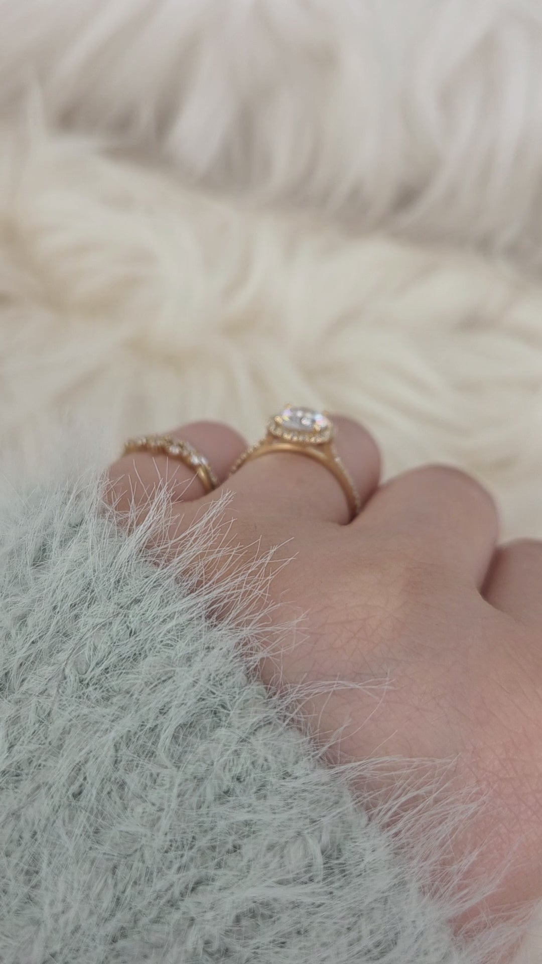 The Kubian ring captures light in a circle of elegance. An 8mm round moissanite shines at the center, encircled by a halo of dainty diamonds. Shared-prong diamonds continue halfway down the shank, lending graceful sparkle from every angle. Cast in 14kt rose gold, this round halo design blends romance with modern refinement—an engagement ring that feels both classic and unique. Ready to ship after resizing
