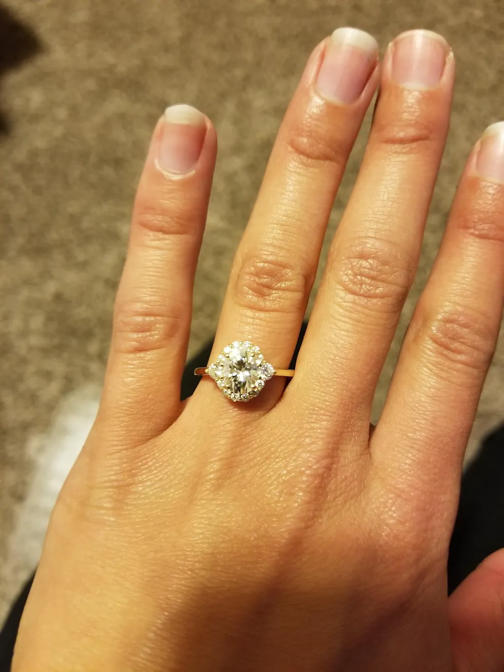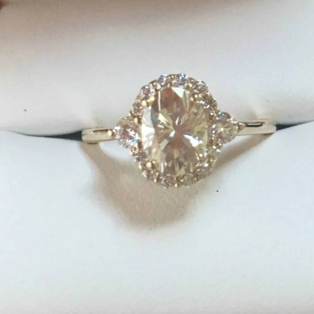 I'm in love! My ring fits perfectly and arrived on time. My only thing I will say, the center stone is tinted slightly yellow which I wasn't aware of initially from the pictures online but it compliments the gold band so I'm fine with it. Amanda was great and very helpful with any questions I had. Will definitely be purchasing the matching band in the future. Love it!!!