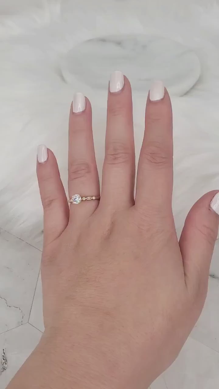 Experience timeless elegance with the Gale Solitaire Ring. At its center shines a brilliant 5mm moissanite, accented by sparkling diamonds that enhance its art deco–inspired charm. The shank features a unique pattern, adding a touch of vintage detail to this modern classic. Handcrafted in your choice of 14kt yellow, white, or rose gold, the Gale ring is the perfect blend of sophistication and style—ideal as an engagement ring or a meaningful statement piece.