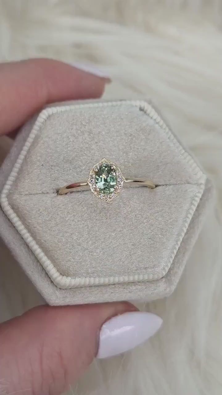 A fresh take on classic romance, the Mini Mae ring features a 0.64ct mint tea sapphire glowing at the center of a delicate oval diamond halo. Its gentle hue and fine craftsmanship in 14kt gold make this piece a poetic symbol of love—perfect as a unique engagement ring or a milestone gift with meaning.