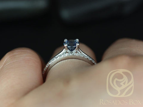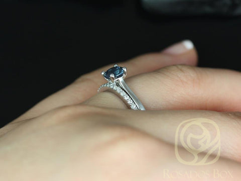 0.79ct Skinny Flora & Marcelle Blue Sapphire Diamonds Dainty Cathedral Solitaire Round Bridal Set