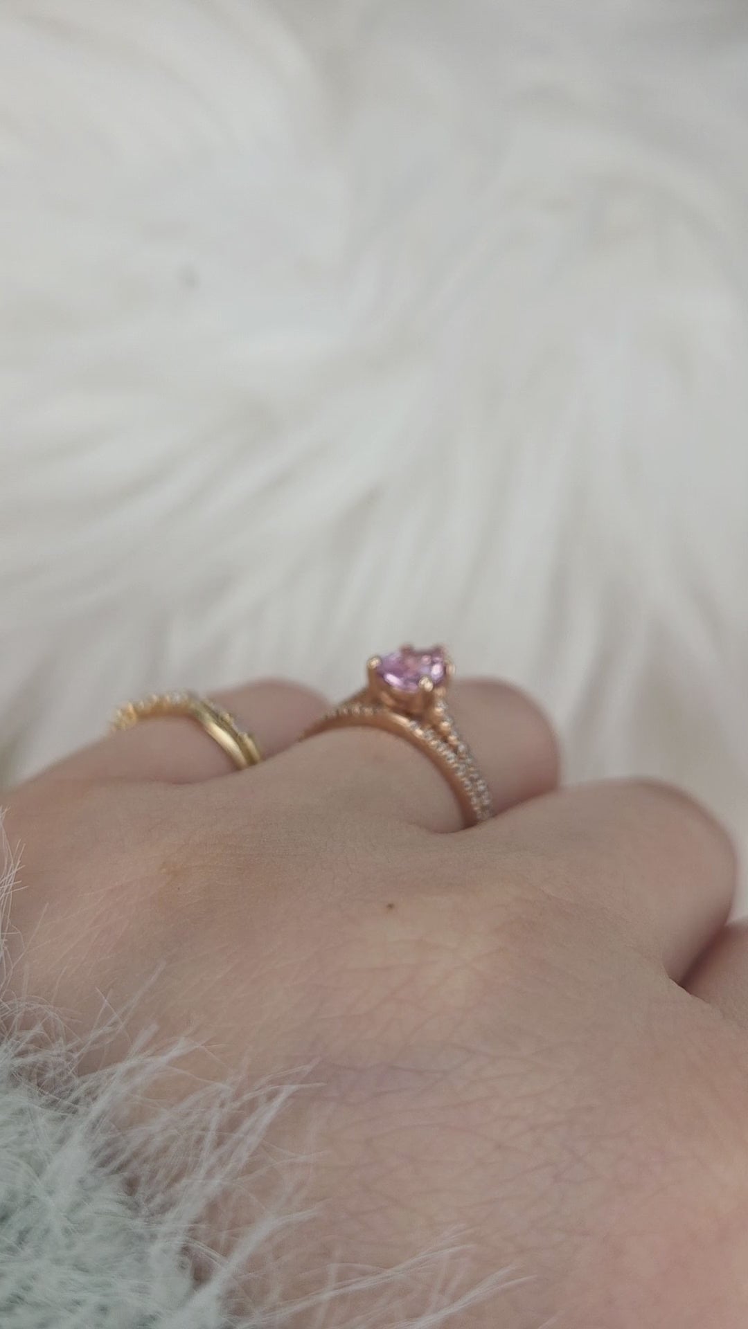 1.09ct Ann 14kt Rose Gold Peach Blush Sapphire Diamond Dainty Cathedral Bridal Set