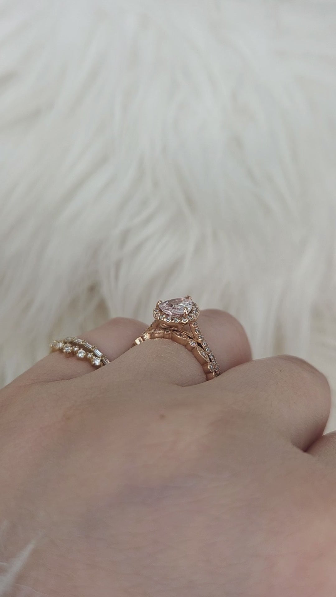 Home/Collections/1.13ct Tabitha & Gwen 14kt Rose Gold Peach Champagne Sapphire Diamonds Pear Halo Bridal Set
