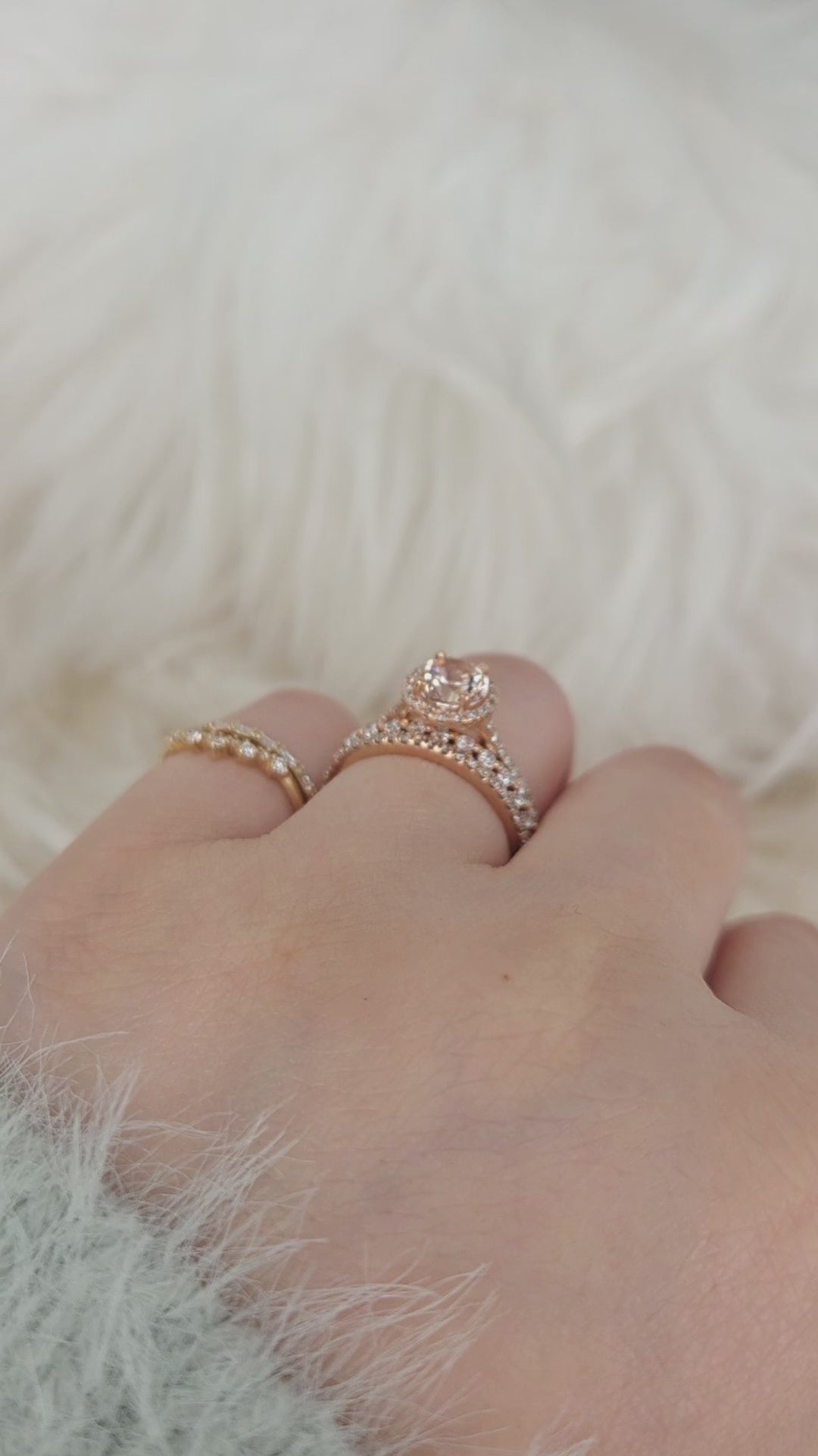Bold elegance with a soft glow. The 1.33ct Kubian bridal set showcases a round Light Icy Butter Champagne sapphire with dreamy notes of peachy blush. Nestled in a dainty diamond halo and set in 14kt rose gold, the engagement ring features a cathedral-style shank adorned with delicate diamonds. This stunning centerpiece is beautifully complemented by a Petite Naomi single prong diamond band and a matching diamond ring—stacked together for a luxurious, luminous trio that’s handcrafted with recycled gold and conflict-free stones.