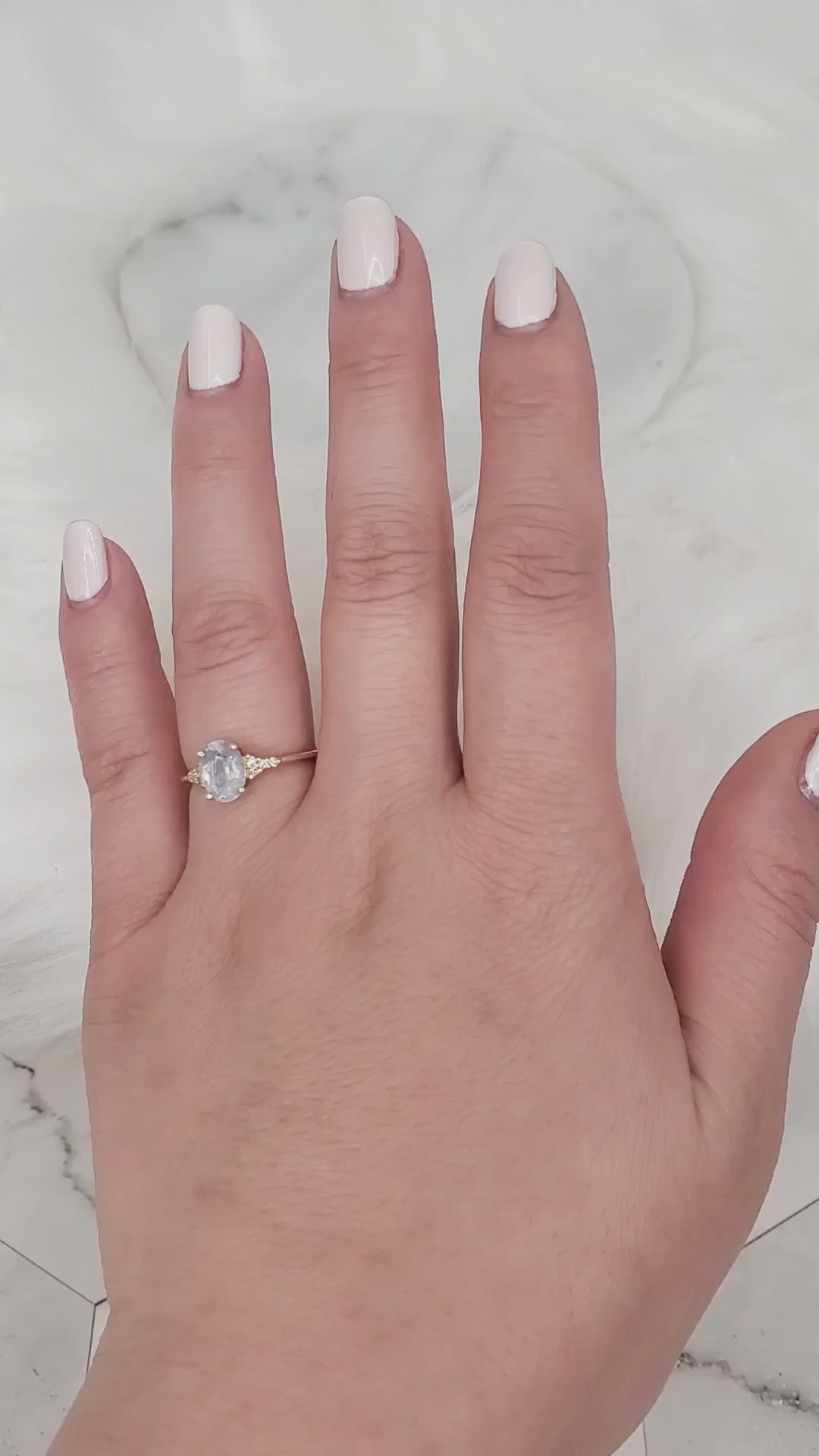 Drift into a starlit reverie with our Maddy cluster ring, where a 1.46ct oval sapphire shimmers in an icy galaxy blue hue, speckled like snow beneath moonlight. A cluster of pavé-set diamonds sparkles around the center, adding celestial brilliance to the warmth of 14kt yellow gold. Dreamy and delicate, Maddy captures the magic of quiet nights and starry skies—perfect for the soul who sees beauty in the cosmos and poetry in the details.