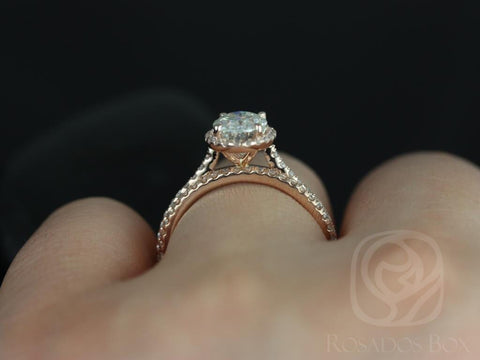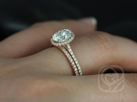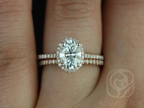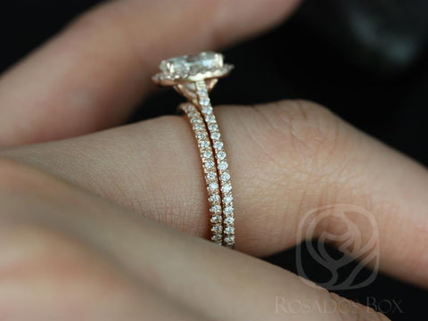 The Rachel Bridal Set is a dazzling union of harmony and romance. At its heart glows an 8x6mm oval moissanite, embraced by a sparkling halo and diamonds that trail halfway down the shank. Paired with the matching Rachel diamond band, the set feels complete with an art deco flair. Handcrafted in 14kt rose gold, this set layers timeless elegance with modern sophistication—perfect for celebrating a love story meant to last forever.