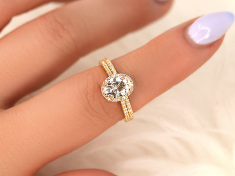 The Rebecca Bridal Set is a dazzling union of harmony and romance. At its heart glows an 8x6mm oval moissanite, embraced by a sparkling halo and diamonds that trail halfway down the shank. Paired with the matching Rebecca diamond band, the set feels complete with an art deco flair. Handcrafted in your choice of 14kt rose, white, or yellow gold, this set layers timeless elegance with modern sophistication—perfect for celebrating a love story meant to last forever.