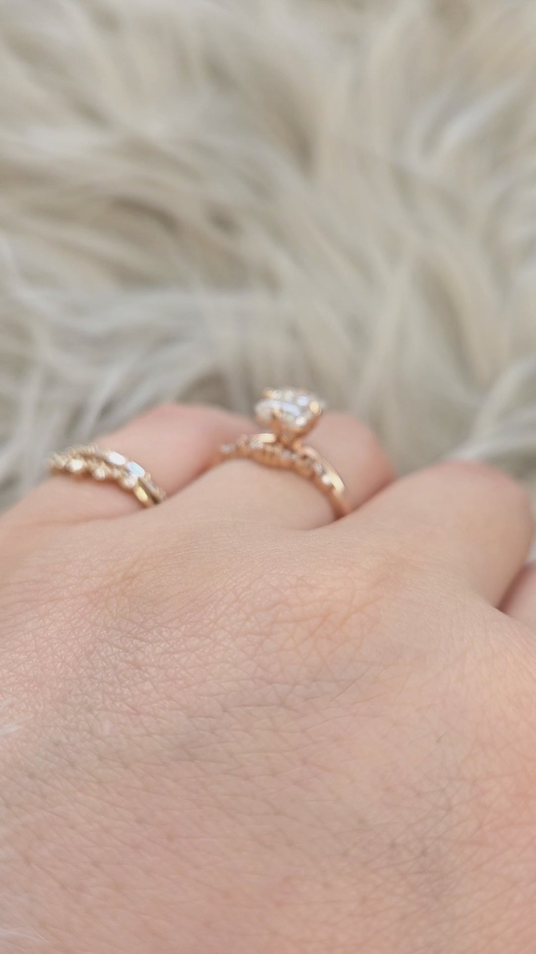 The Ruth & Azalea bridal set captures romantic refinement with an organic touch. A 8x6mm emerald cut moissanite rests in a dainty solitaire with talon prongs, while the Azalea band curves gracefully around the center stone, its delicate diamonds forming a soft wreath of light. Handcrafted in 14kt gold in your choice of color.
