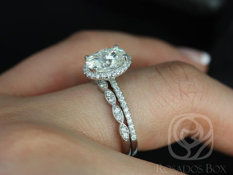 The Federella & Christie bridal set embodies effortless elegance with a modern twist. At the heart of this design is a 9x7mm oval moissanite surrounded by a delicate diamond halo, offering a balance of sparkle and sophistication. Paired with the Christie vintage inspired diamond band, this handcrafted 14kt gold set blends timeless form with contemporary charm. Perfect for the modern bride who adores dainty details and refined brilliance.