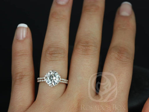 The Kitana bridal set shines with celestial elegance. At its center, a 8mm round moissanite sparkles within a compass-set cushion halo, surrounded by dazzling diamond side stones that catch the light from every angle. Paired with a delicate matching diamond band, this handcrafted 14kt gold set—available in rose, white, or yellow—blends timeless romance with modern brilliance for a look that’s radiant and unforgettable.