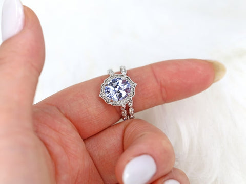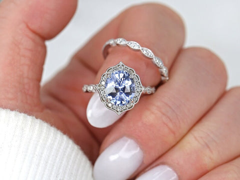 Step into a fairytale with the Lana bridal set, a 3.18ct celebration of lilac light and vintage charm. At its heart, a dreamy oval sapphire glows in icy lilac with whispers of indigo and cornflower blue. Framed in an Art Deco–inspired diamond halo and paired with a matching scalloped diamond band, this 14kt white gold set is handcrafted from recycled metals and conflict-free stones. Elegant, romantic, and one-of-a-kind, Lana is the perfect choice for the bride who treasures timeless beauty with a touch of whimsy.
