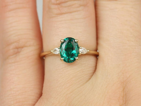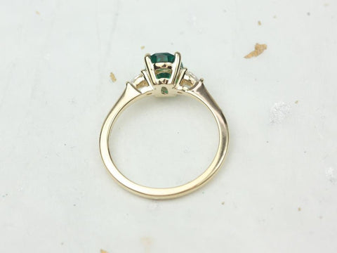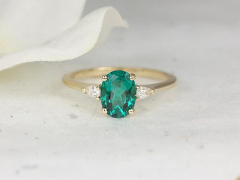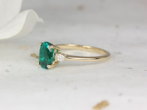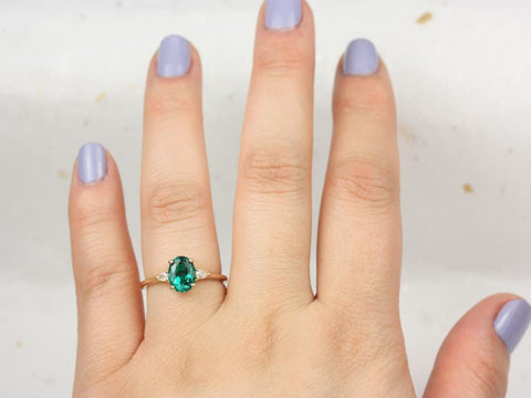 Add a pop of playful elegance to your jewelry collection with the Petite Emery Three Stone Oval Ring. Featuring a stunning 8x6mm oval cut emerald and sparkling diamond side stones, this 14kt gold ring is customizable to your choice of color. Perfect for adding a touch of quirkiness to any outfit.